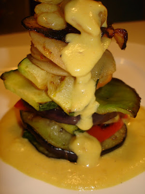 Colocamos en el plato un poco de esta salsa y empezamos a montar capas con las verduras, entre capa y capa colocamos unas gambitas y al terminar de montar las verduras regamos con un poco más de salsa, pero no mucha para que no reblandezca los vegetales.