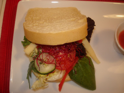 Y lo acompañamos con lechugas variadas, una rodaja de tomate , pepino, pimiento rojo, y brotes de remolacha.