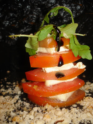 Cortamos el tomate en 5 láminas, y alternamos tomate y tofu hasta terminar la torre.