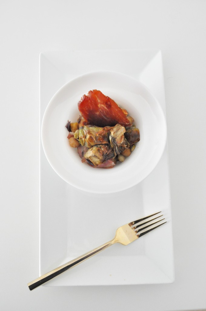 Garbanzos con habitas, alcachofas y peineta Ibérica.